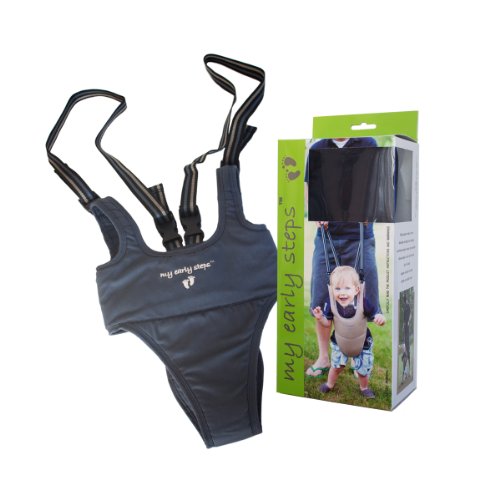 The unique design of my early steps promotes a natural posture for baby (arms are used for balancing, which is key to maintaining balance while transitioning from one foot to the other), visual feedback related to each step (the view of baby's feet is unobstructed), and a natural posture for the adult (comfortably upright the adult benefits from not experiencing back pain in result of bending). The distinctive shell design of my early steps cradles baby's entire torso and ensures maximum stability. The lower part of the walker absorbs part of baby's weight and prevents the top part from gathering up under baby's arms during use. The wide leg openings allow free leg movement so that baby can gradually build up the upper muscle strength required for independent walking. The most unique feature of my early steps is the three-point fastening on the back. Situated close to the center of gravity of the baby it includes the lower point of attachment of the support straps. This is important because babies' center of gravity lies much higher than that of adults, making them top heavy; therefore positioning the point of attachment of the support straps close to the center of gravity affords maximum control for the adult and maximum support for the top heavy infant. The three-point fastening allows for adjustments for baby's chest circumference (or thicker outerwear) and makes it possible to create a snug fit. The support straps are easily removable and adjustable in length to accommodate adults of various heights. It is possible to let baby crawl without undue risk of entanglement if baby temporarily tires of walking - no need to remove the entire baby walker from baby, only the support straps. my early steps is recommended for use with infants who have demonstrated an ability to stand while supporting themselves against furniture or holding onto an adult's hand, have a minimum chest circumference of 19 inches, weigh less than 30 pounds, and are at least 8 months old.