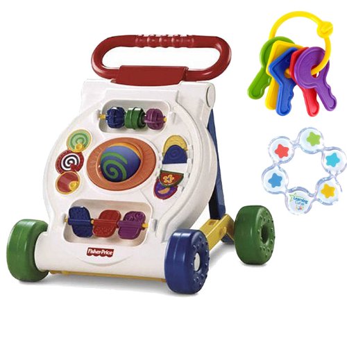 This colorful Bright Beginnings activity walker kit by Fisher Price includes a walker, keys teether, and floating star teether to keep baby entertained and to develope motor skills. The activity walker folds up for easy portablity and storage.