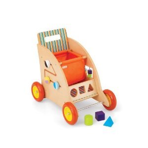 This sturdy but stylish durable wood cart is brimming with built-in activities, lots of storage space in the heavy nylon pocket, and an anti-tip braking function for beginning walkers. Colorful bead-bars, chunky wood shapes with sorter, and space for teddy bears and toys make this a hands-on favorite for years. For 12 months plus.